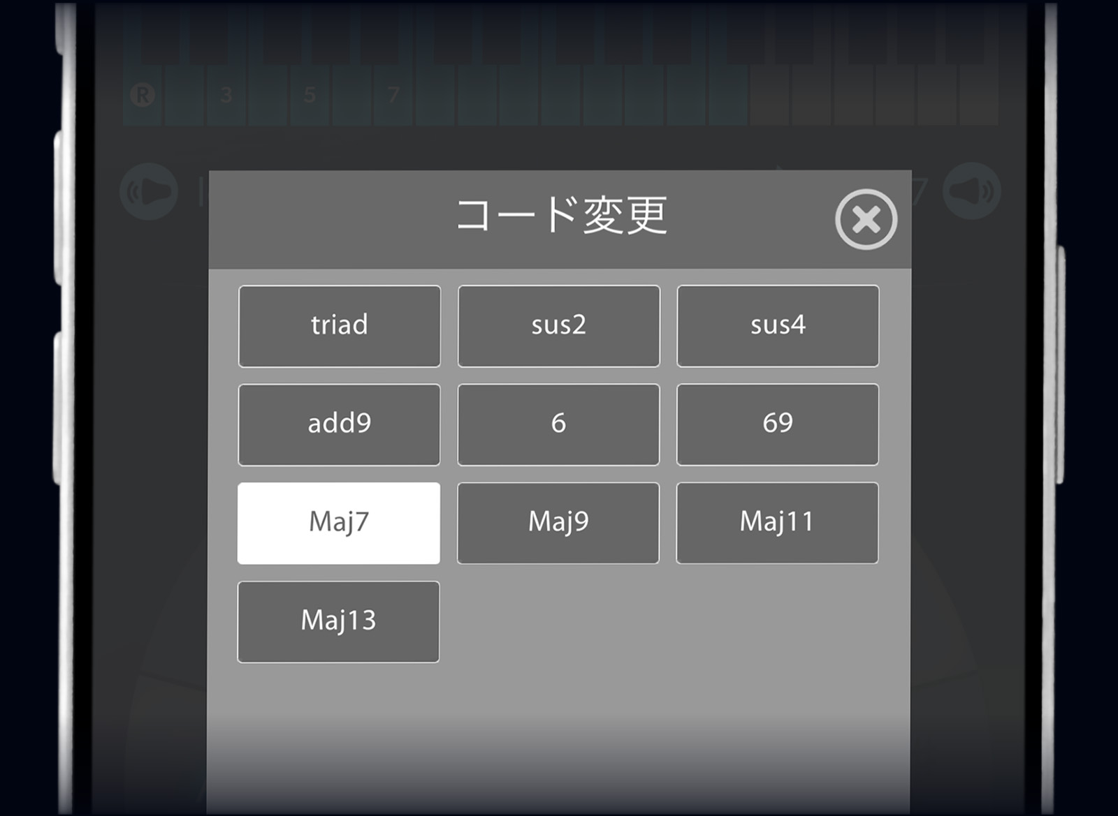 それぞれのコードを選んで頂くと、構成音がキーボード上に視覚的に表示され、コードの再生もできます。