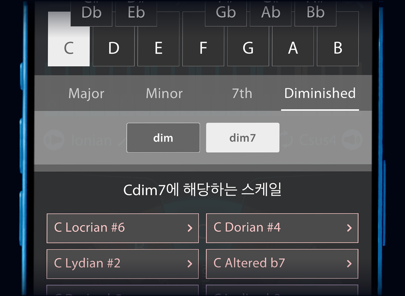 원하는 코드를 선택하면, 그에 대응하는 스케일 리스트가 표시됩니다.